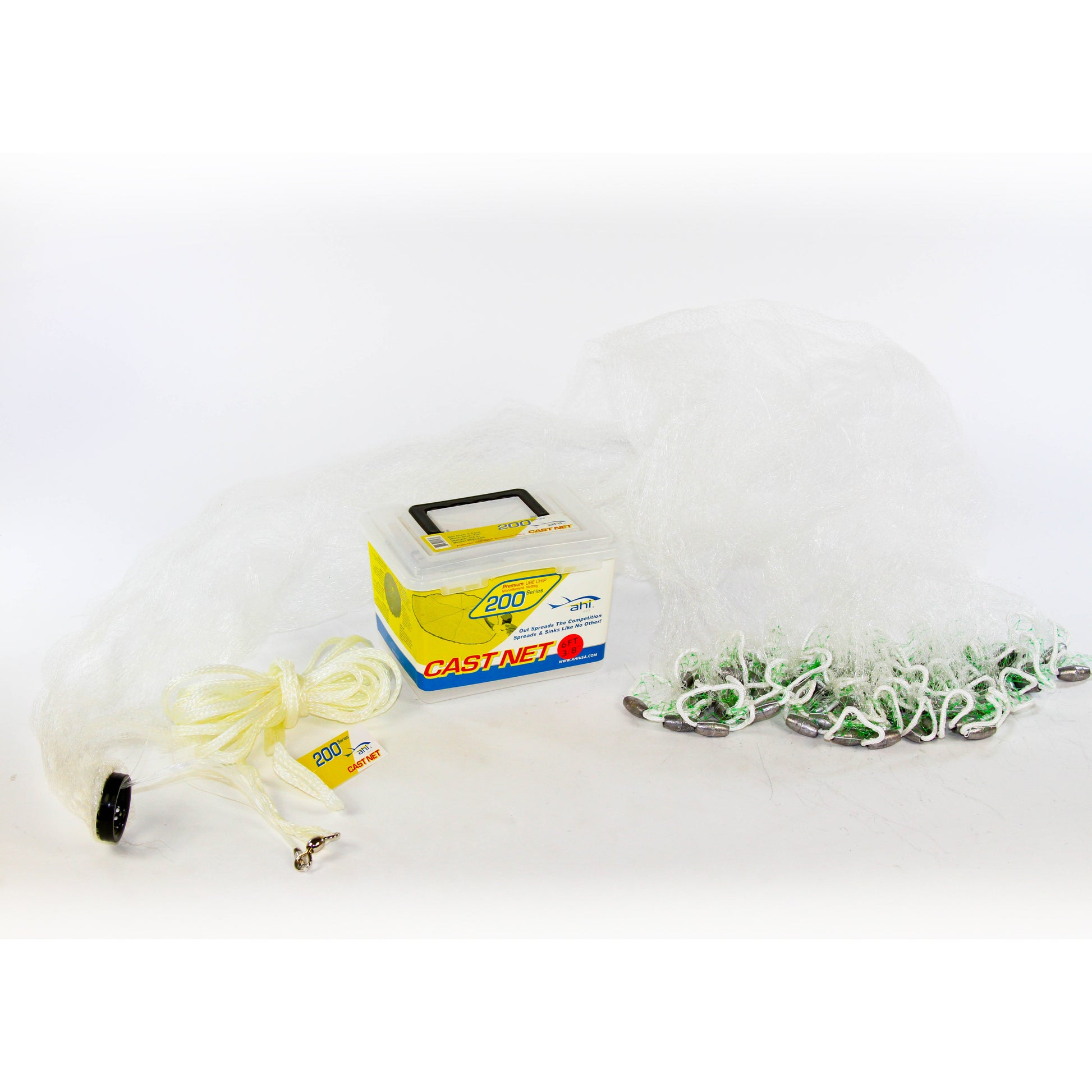 Ahi USA 200 Series Casting Nets are made for targeting a variety of bait. Premium UBE Chip Monofilament3/8in square mesh80lbs test Braille Lines3/4lbs of actual lead weight per foot24ft handline secured with heavy duty anodized swivel Packed in reusable hard plastic container.