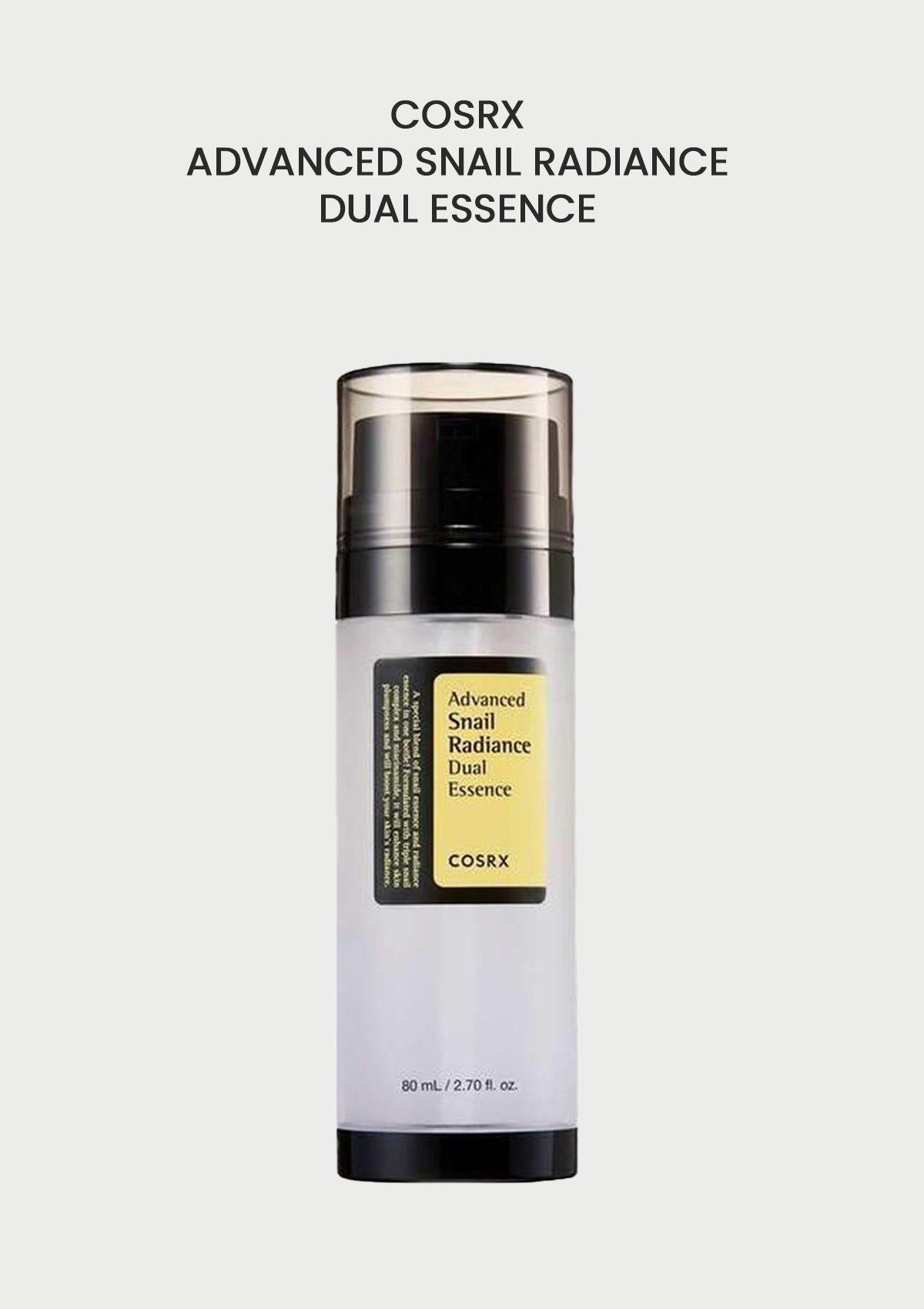 The Cosrx Advanced Snail Radiance Dual Essence is a great multi-tasker for your skin! It has snail secretion filtrate that helps makes your skin cells firm and elastic. It also contains Niacinamide that protects your skin barrier and brightens it from within! Also, it leaves your skin feeling refreshed and soft! .