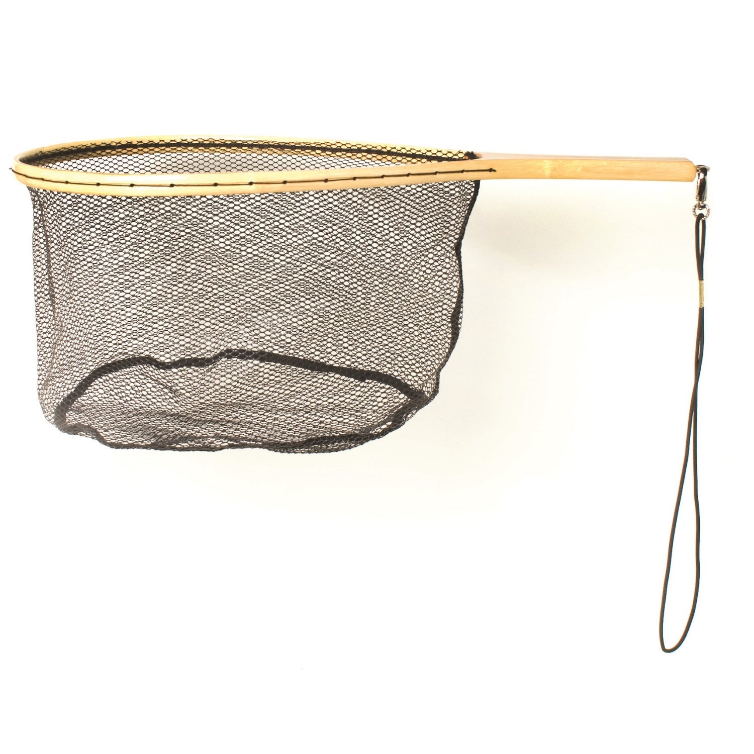 Bamboo wood finish Black rubberized netting Equipped with safety cord It will corral the fieistiest fish in the water Measures 16.5 x 11 x 24.25.