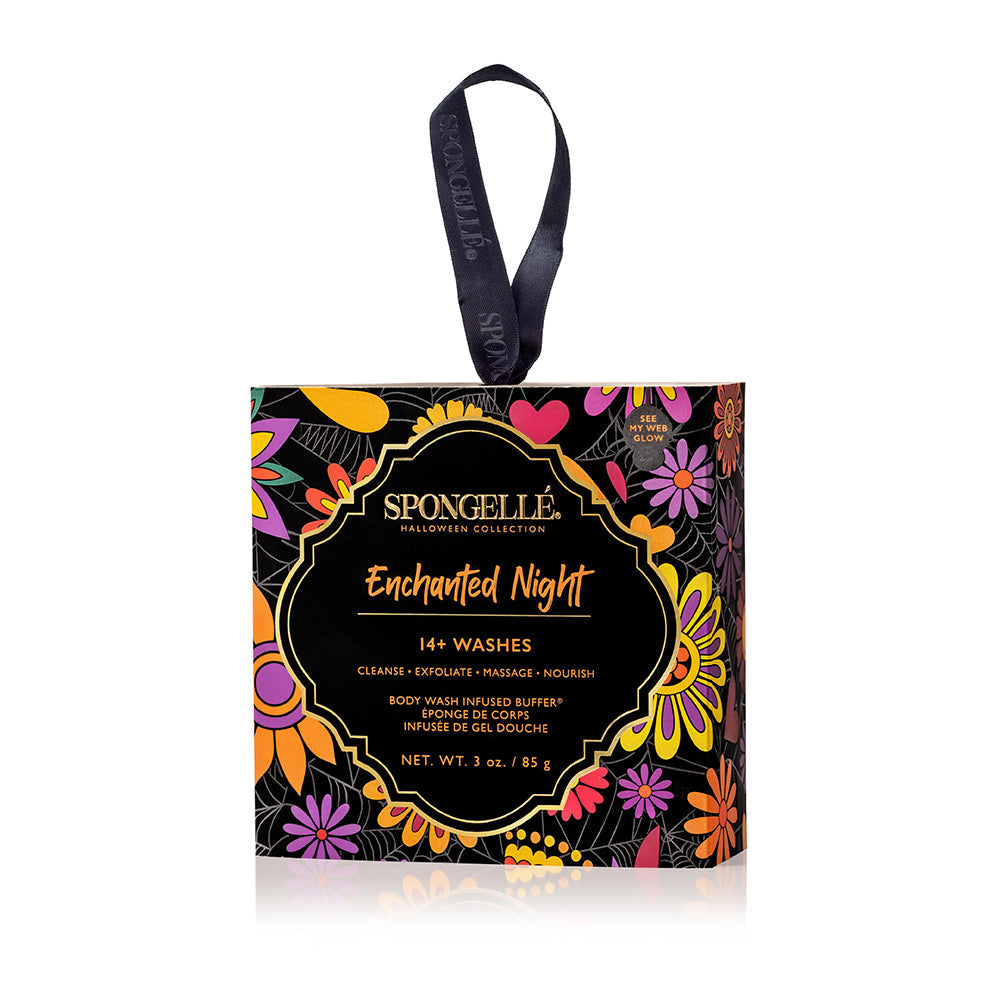 Experience the seductive scent of Spongellé’s Halloween Collection in Enchanted Night—complete with a limited-edition glow-in-the-dark packaging for all the starry night feels. Enriched with Witch Hazel extracts and autumnal notes of juicy orange, fresh pumpkin, and vanilla musk, this captivating body wash-infused buffer gently cleanses and softens skin with the glowing allure of starry nights for 14+ intoxicating showers.