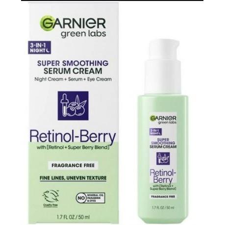 Garnier Green Labs Retinol-Berry Super Smoothing Night Serum Cream is 3 products in 1 bottle: the 24 hour moisture of a night cream, the power of a line smoothing retinol serum, and rejuvenation of an eye cream all in one fast-absorbing formula.