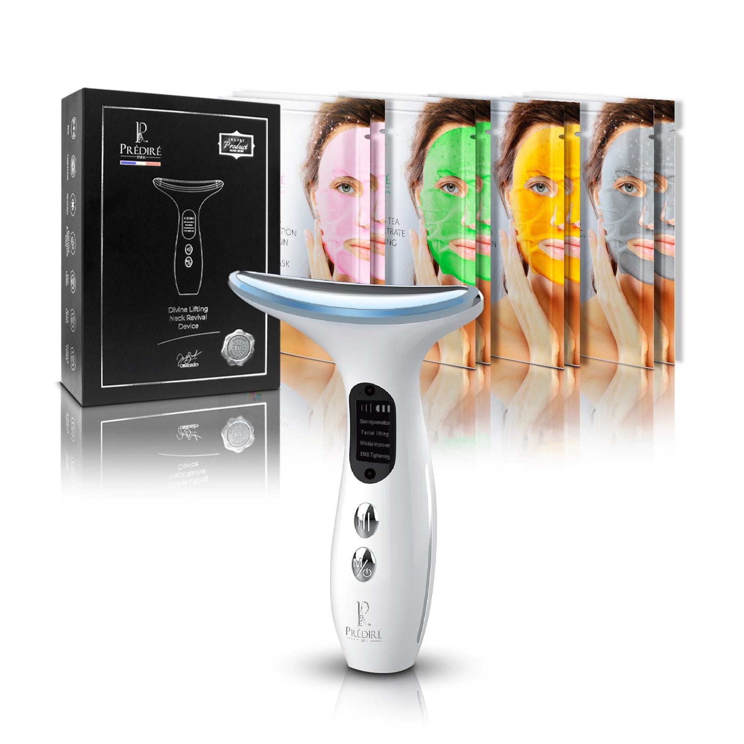 Elevate your skincare regimen to new heights with the Neck & Skin Perfection Therapy Ensemble, a specially curated collection that combines targeted neck rejuvenation with a comprehensive facial treatment experience. Central to this luxurious set is the Divine Lifting Neck Revival Device, boasting advanced light therapy and EMS functionalities. Tailored to the delicate neck area, this device firms, lifts, and smooths, addressing the visible signs of aging with precision. Complementing this cutting-edge tool, the ensemble includes two pieces each of specially selected facial masks - Tea Tree Concentrate Tissue Bonding Mask for its calming and clarifying properties, Moroccan Liquid Gold Multi-Vitamin A, C, and E Mask for a rich, nourishing boost, Skin Shield Anti-Aging, Firming and Tightening Mask to enhance skin's elasticity and resilience, and Transformation Collagen Skin Tightening Solution Mask for its potent firming and rejuvenating effects. This comprehensive collection works synergistically to rejuvenate, protect, and transform your neck and facial skin, revealing a smoother, more radiant complexion that glows with health.