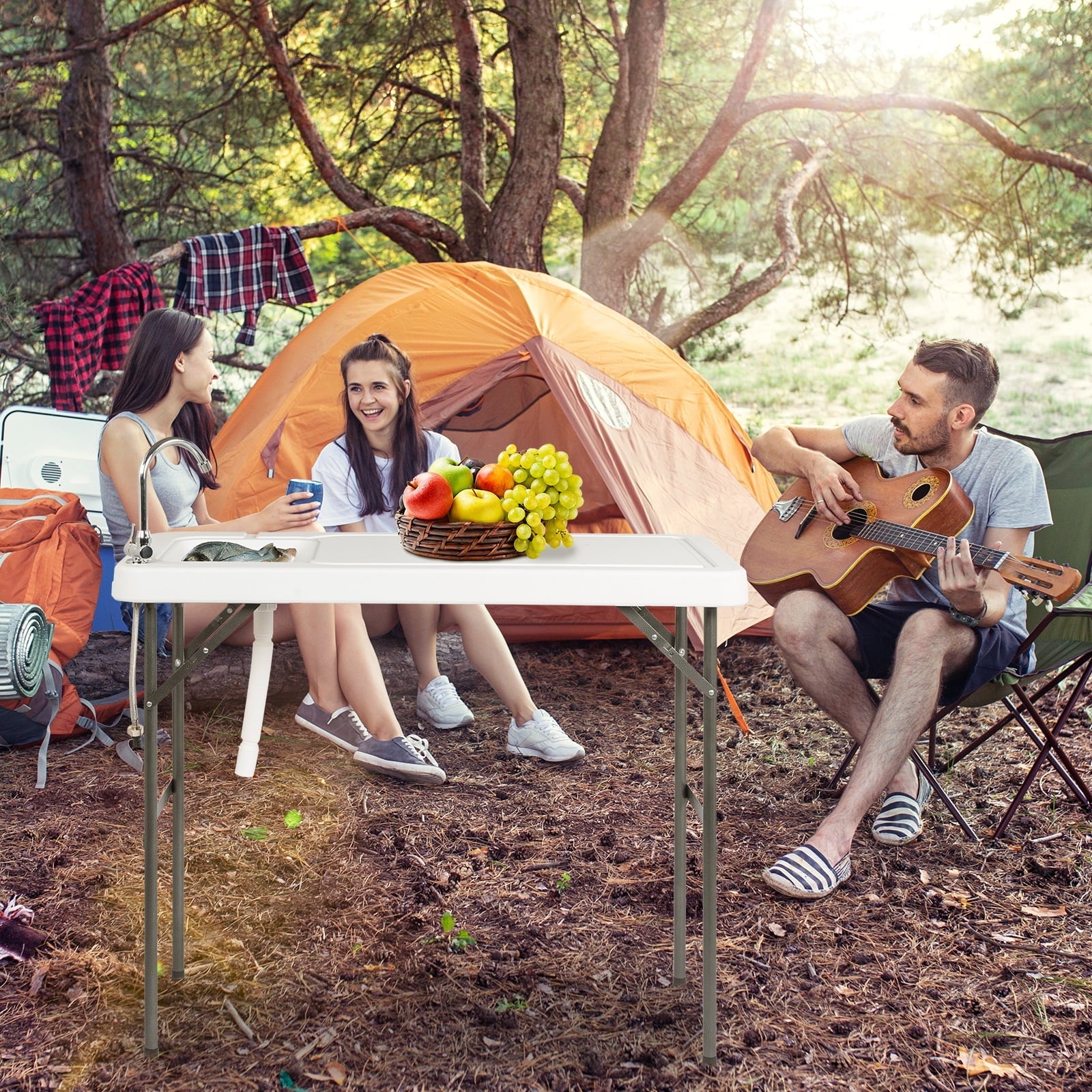 Introductions:The Folding Portable Fish Fillet & Hunting & Cutting Table with Sink Faucet features an easy-to-clean tabletop with built-in sink and faucet, particularly suitable for cleaning fish, vegetables and fruits in the garden or at the campsite. The table top is constructed of high density polyethylene (HDPE) to offer high strength, water resistance, fire retardance and durability. The legs are made from high-grade steel with coated finish. To use this table, simply attach water hose to the faucet for clean running water, and place a bucket under the drain hose to catch the wastewater.