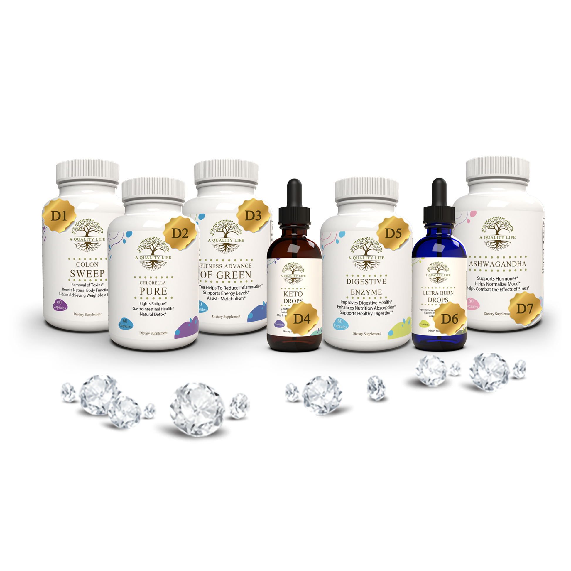 This comprehensive kit comprises D1: Colon Sweep, D2: Chlorella Pure, D3: Fitness Advance of Green, D4: Keto Drops, D5: Digestive Enzyme, D6: Ultra Burn Drops, and D7: Organic Ashwagandha. Each product has been meticulously selected to contribute to a leaner, healthier you.