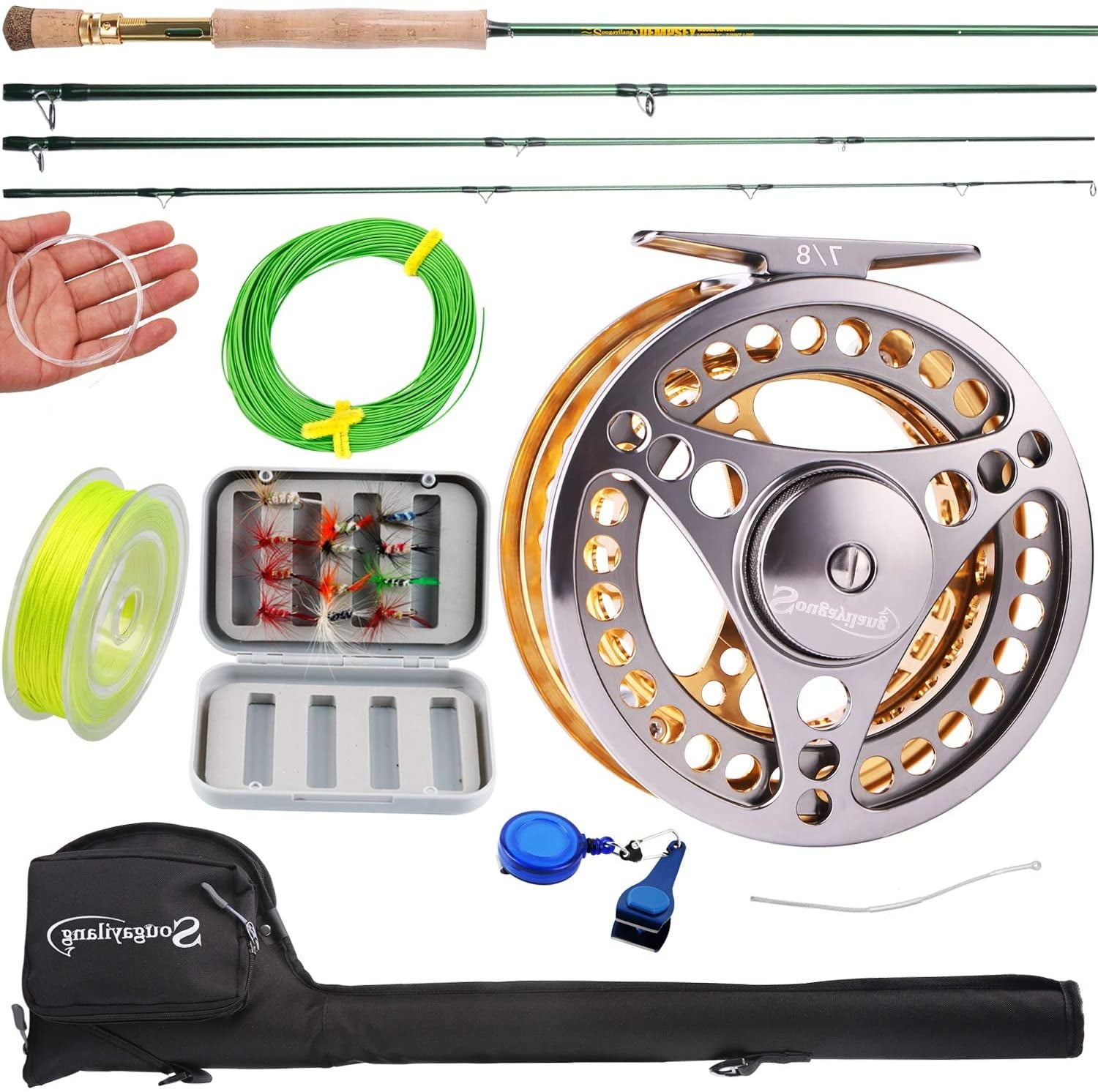 Fishing Full Kits with Carrier Case Package Included: 1 x Fly Fishing Rod 1 x Fly Fishing Reel 1 x 100FT Fishing Line 1 x Backing Line 1 x Tapered Leader 1 x Connectors 1 x zinger&nipper 12 x Fly Fishing Flies 1 x Fishing Gear Carrier Case Fly Rod Detail: 9-feet,4-section super smooth graphite fly rod, breaks down for easy storage and traveling Advanced stainless steel guides for corrosion resistance and durability Comfortable cork handle helps improve casting accuracy and avoids fatigue Carbon fiber blanks generate smooth-loading performance Solid aluminum steel reel seat featuring twin locking rings Fly reel Detail: CNC-machined aluminum alloy construction for high durability and rigidity. Low-profile aluminum alloy spool for smooth line release. Right and left hand retrieval conversion. Rotary knob system to control the line release resistance. Delicate appearance,no wobble,no side play, smooth and easy to control. Clear voices heard When you release the fishing line. Its advanced fiber-composite drag system gives you the control needed to stretch your system to the sporting limit.This fly combos is designed to cover almost every application of fly fishing.Take the Sougayilang 9ft Fly Rod Reel Full Kit on your next fly-fishing trip and enjoy the strong 4-piece rod and Smooth reel.Whether you're battling trout,bass,or panfish,this combo is going to give you a price catch.
